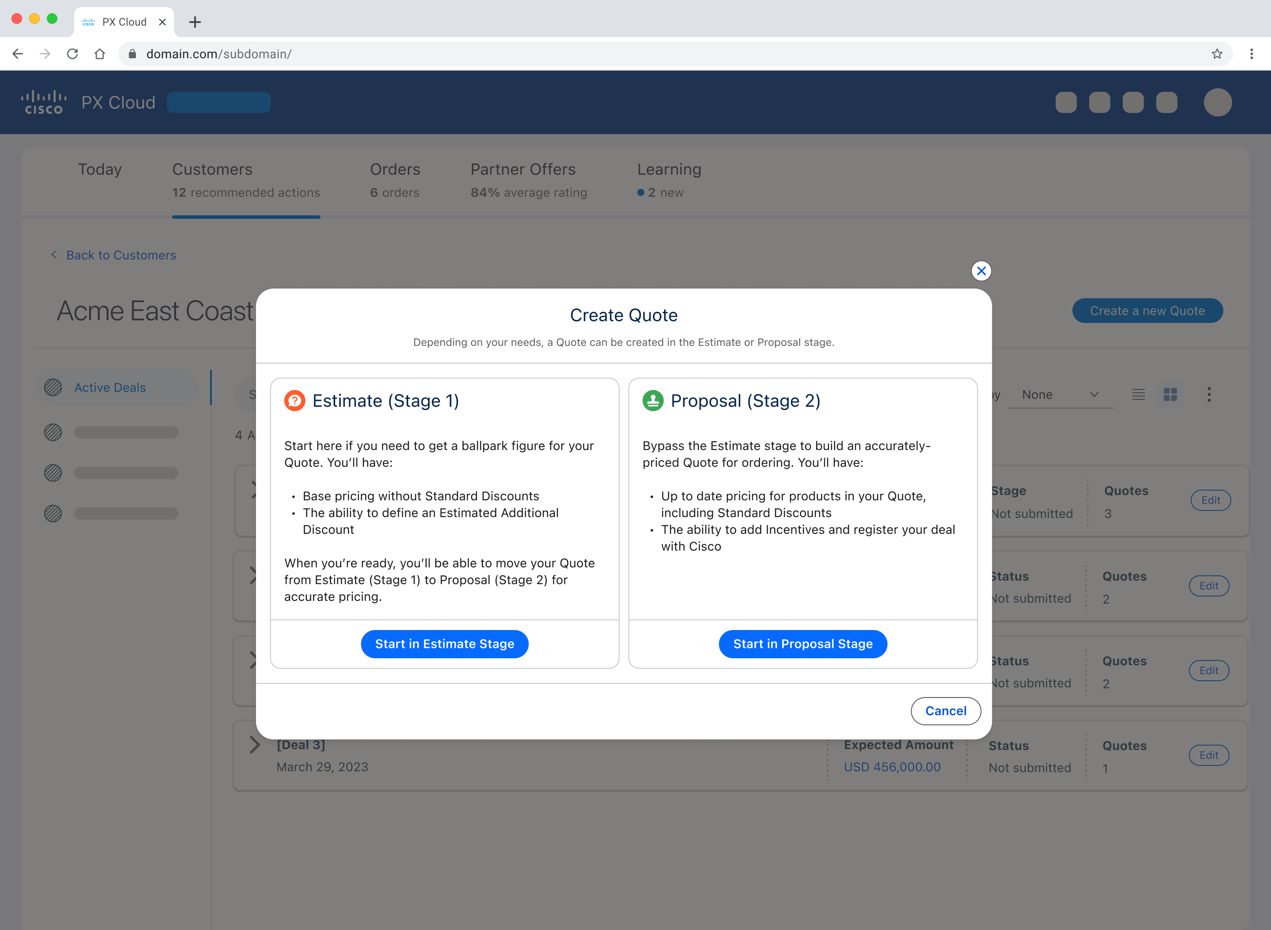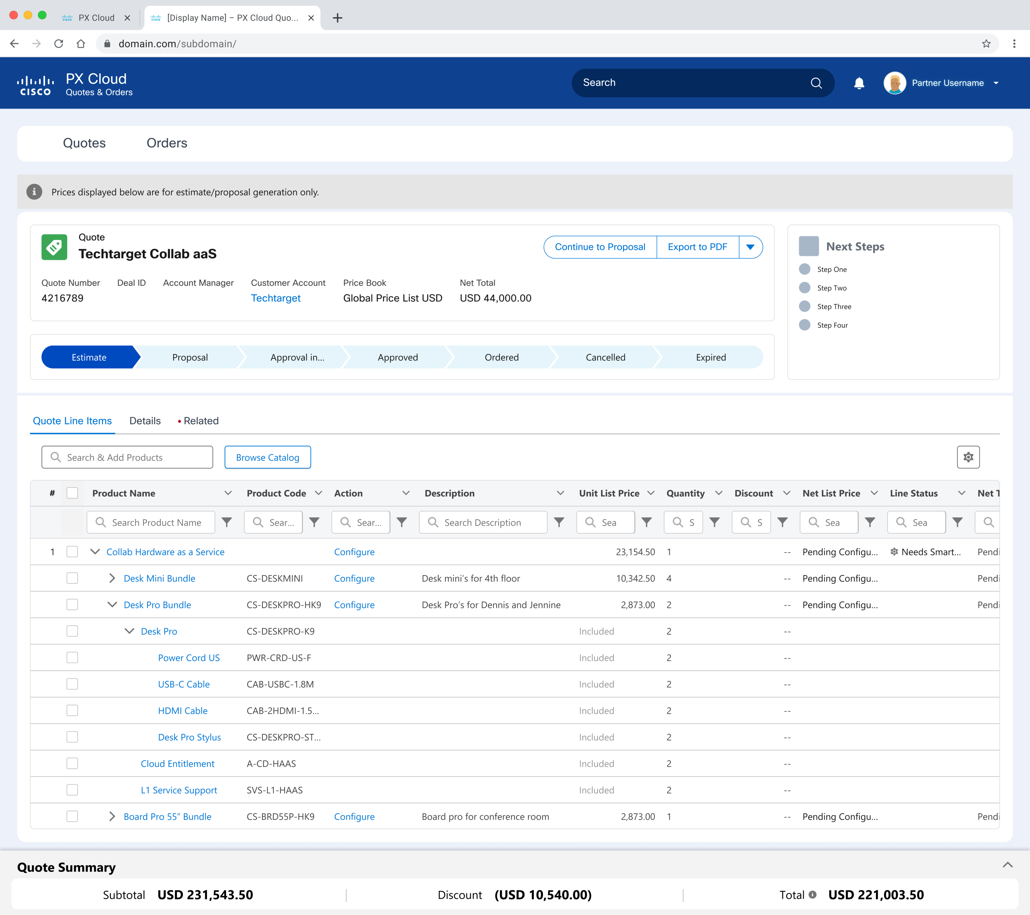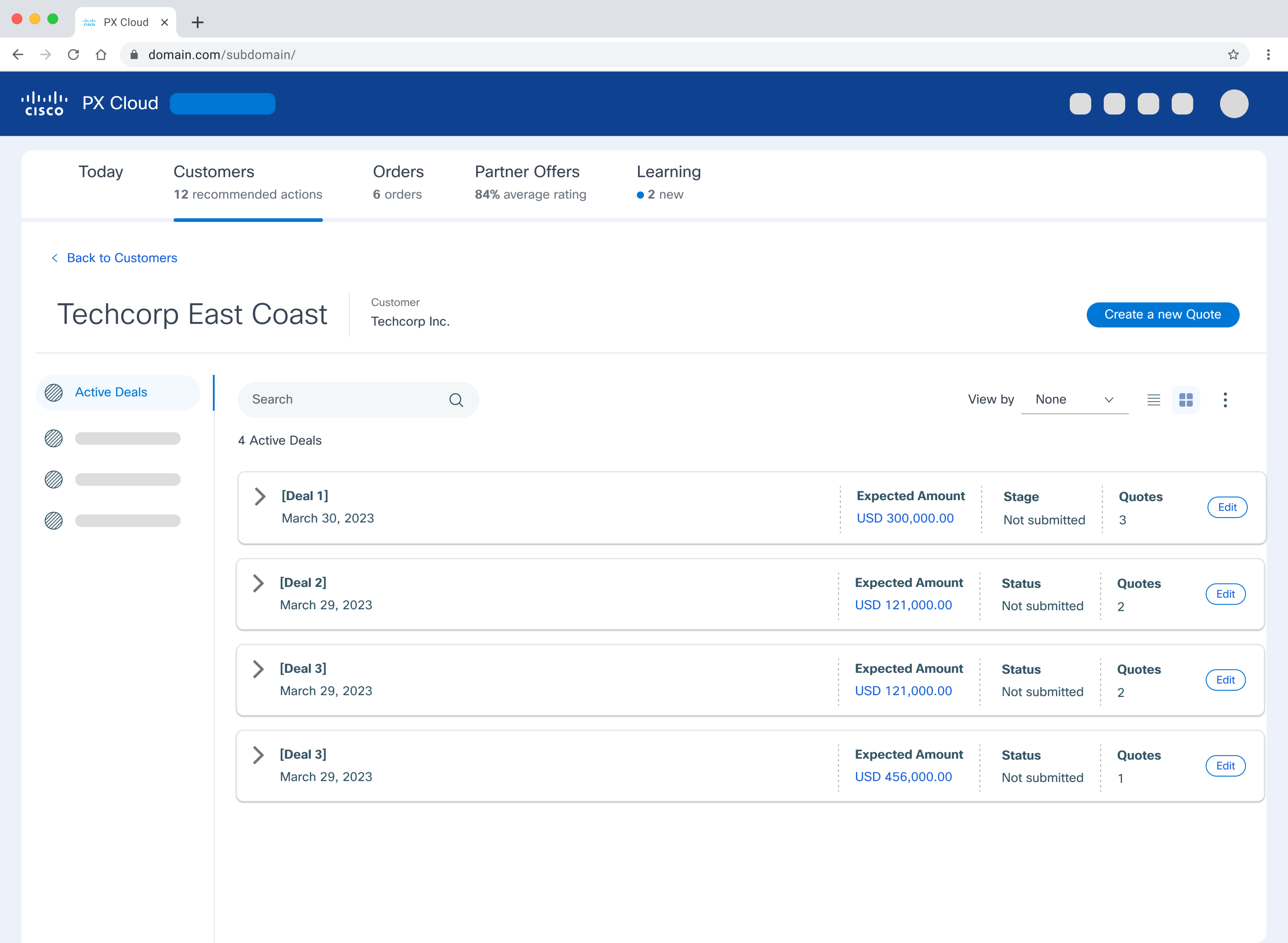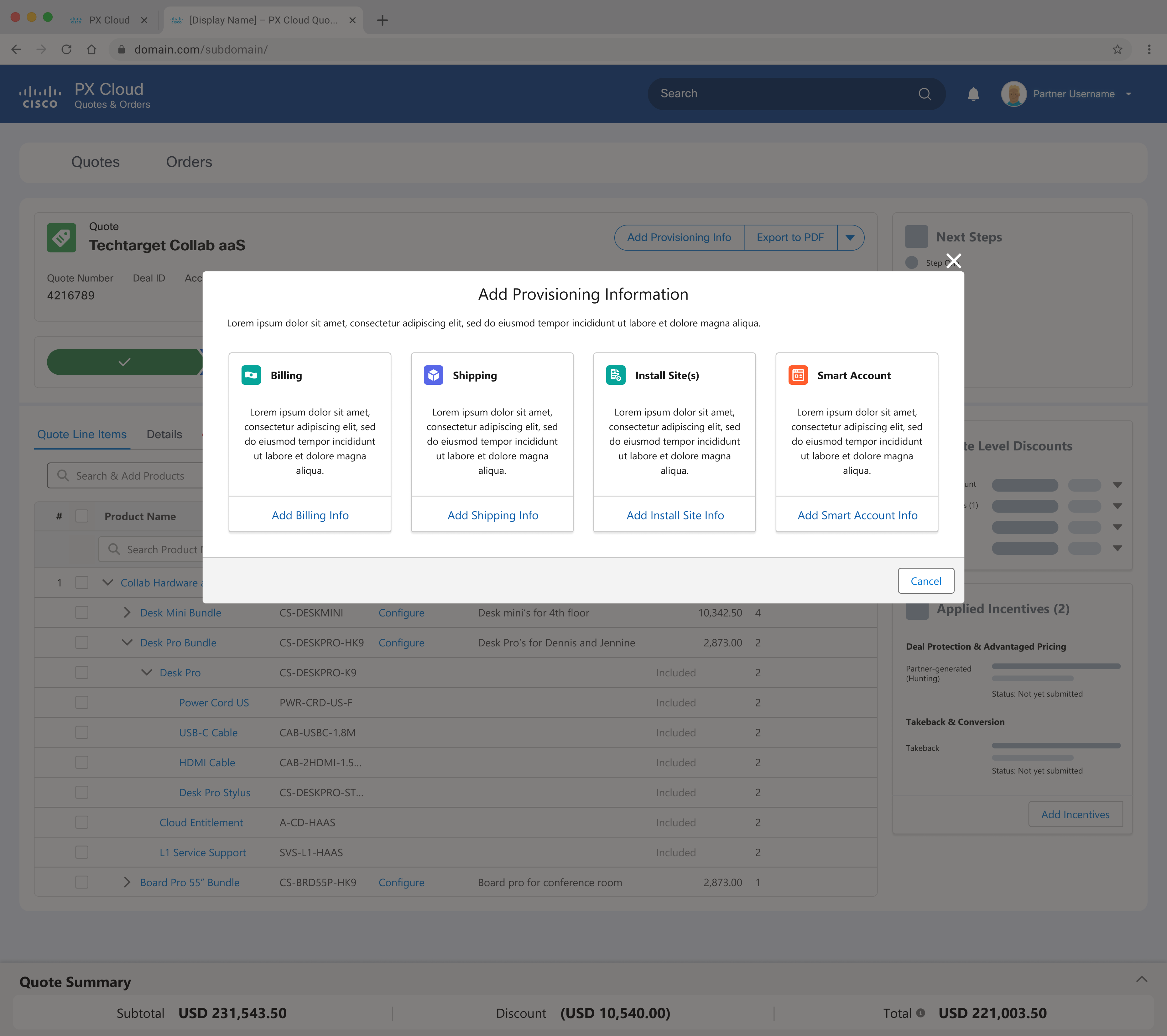 In P1, we evolved the quoting dashboard with Cisco-branded styling, account-level grouping, and a summary panel to surface key actions and activity at a glance.