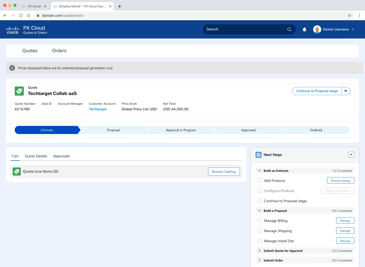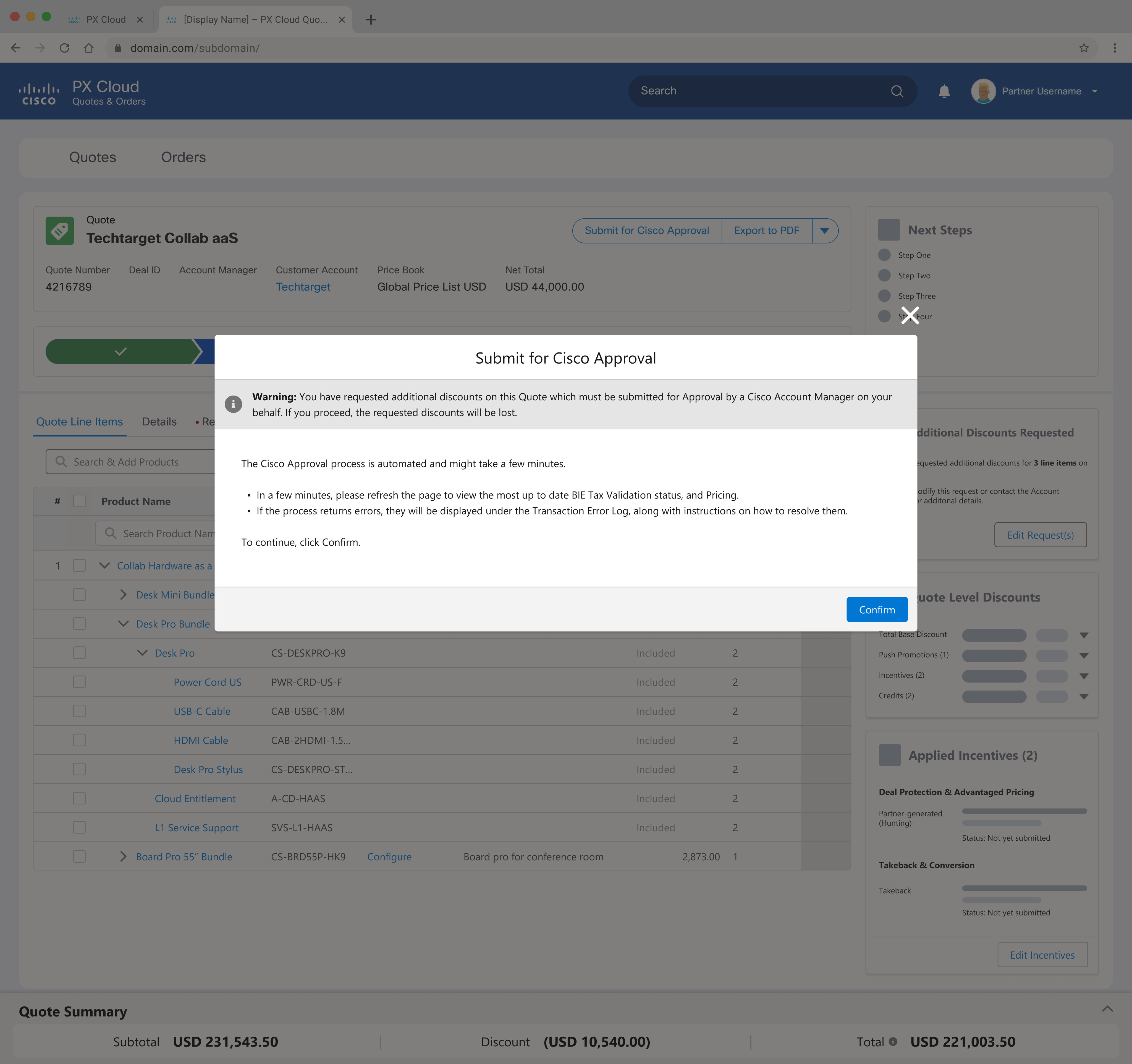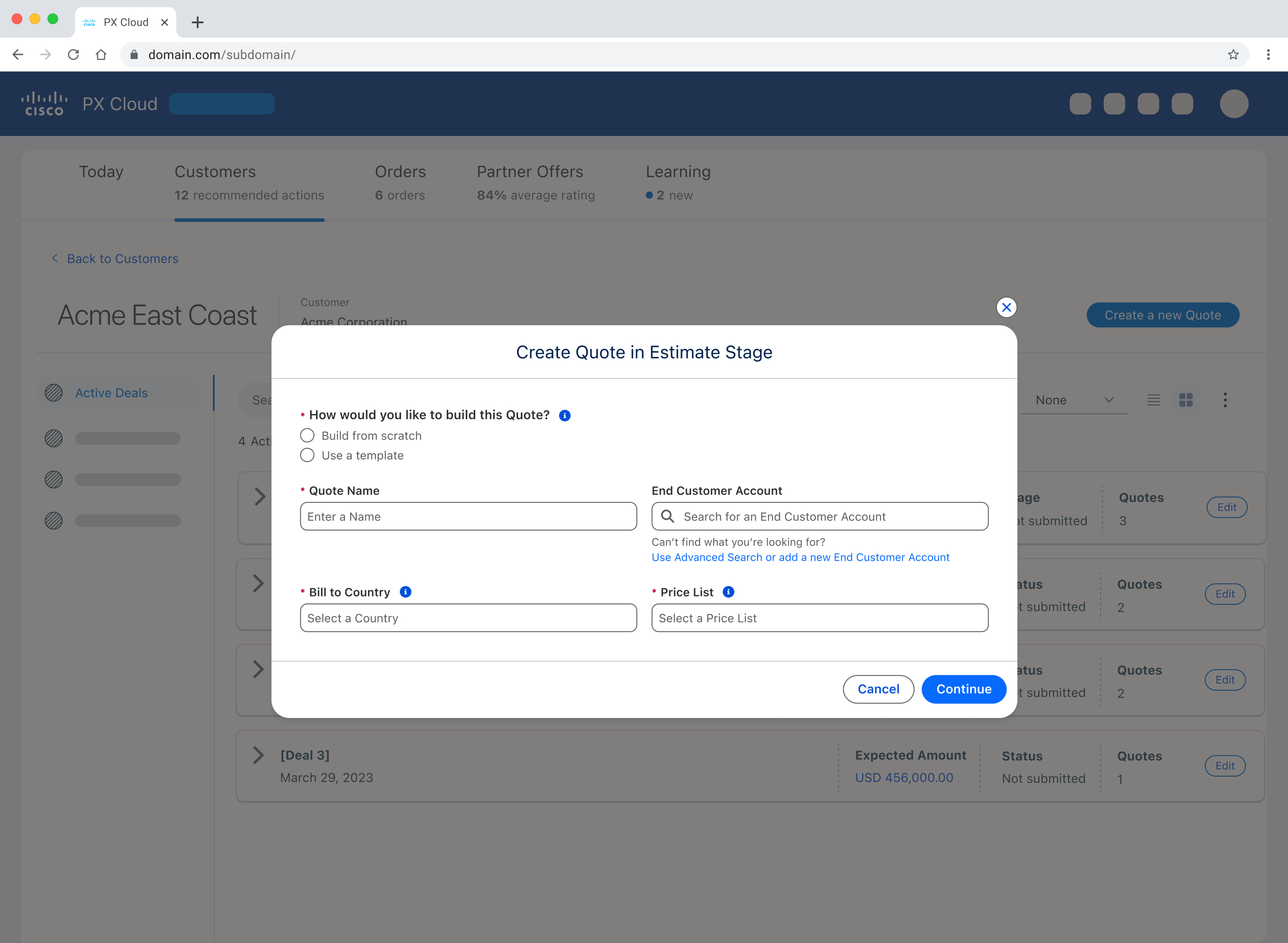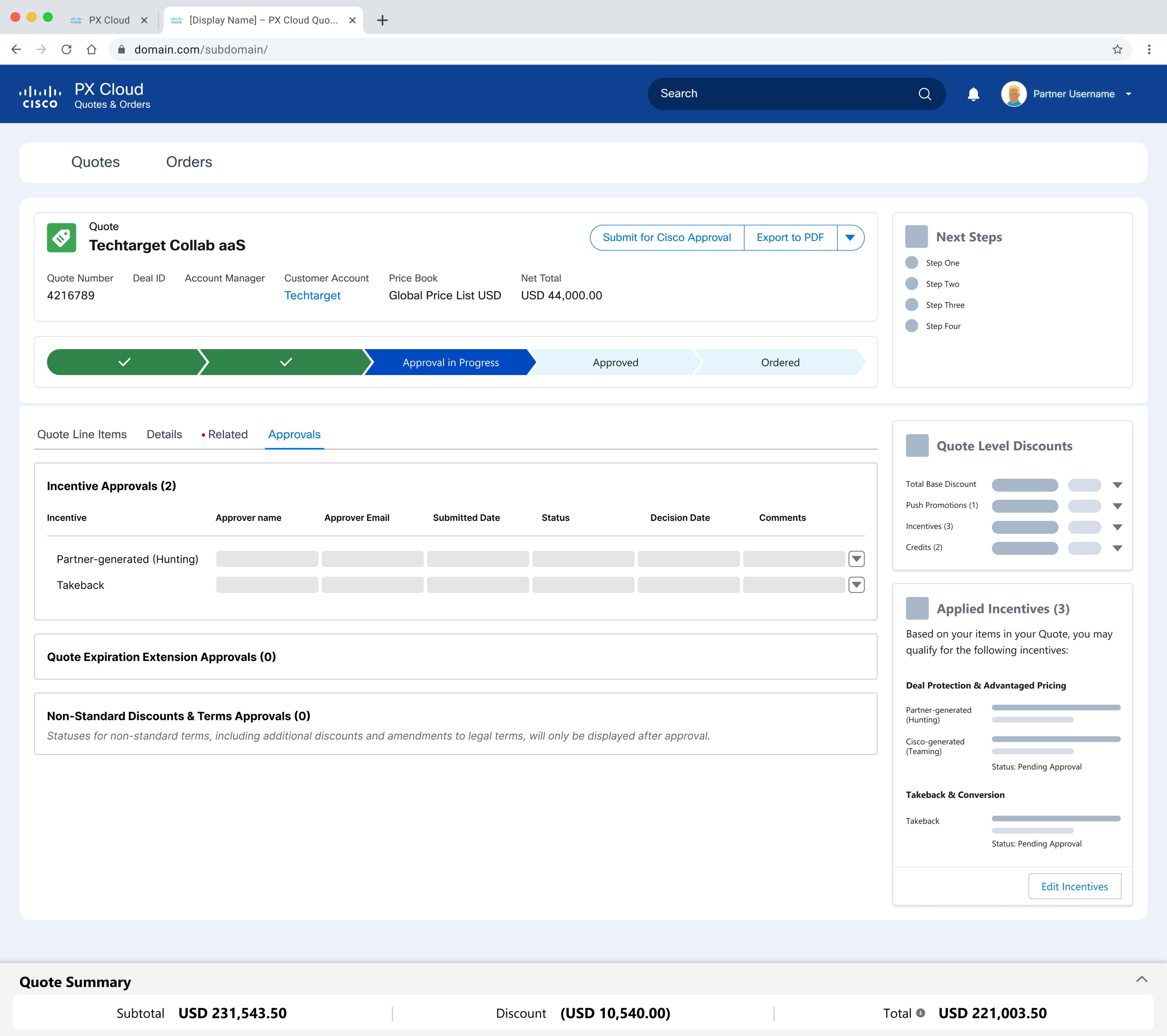 In P1, we evolved the quoting dashboard with Cisco-branded styling, account-level grouping, and a summary panel to surface key actions and activity at a glance.