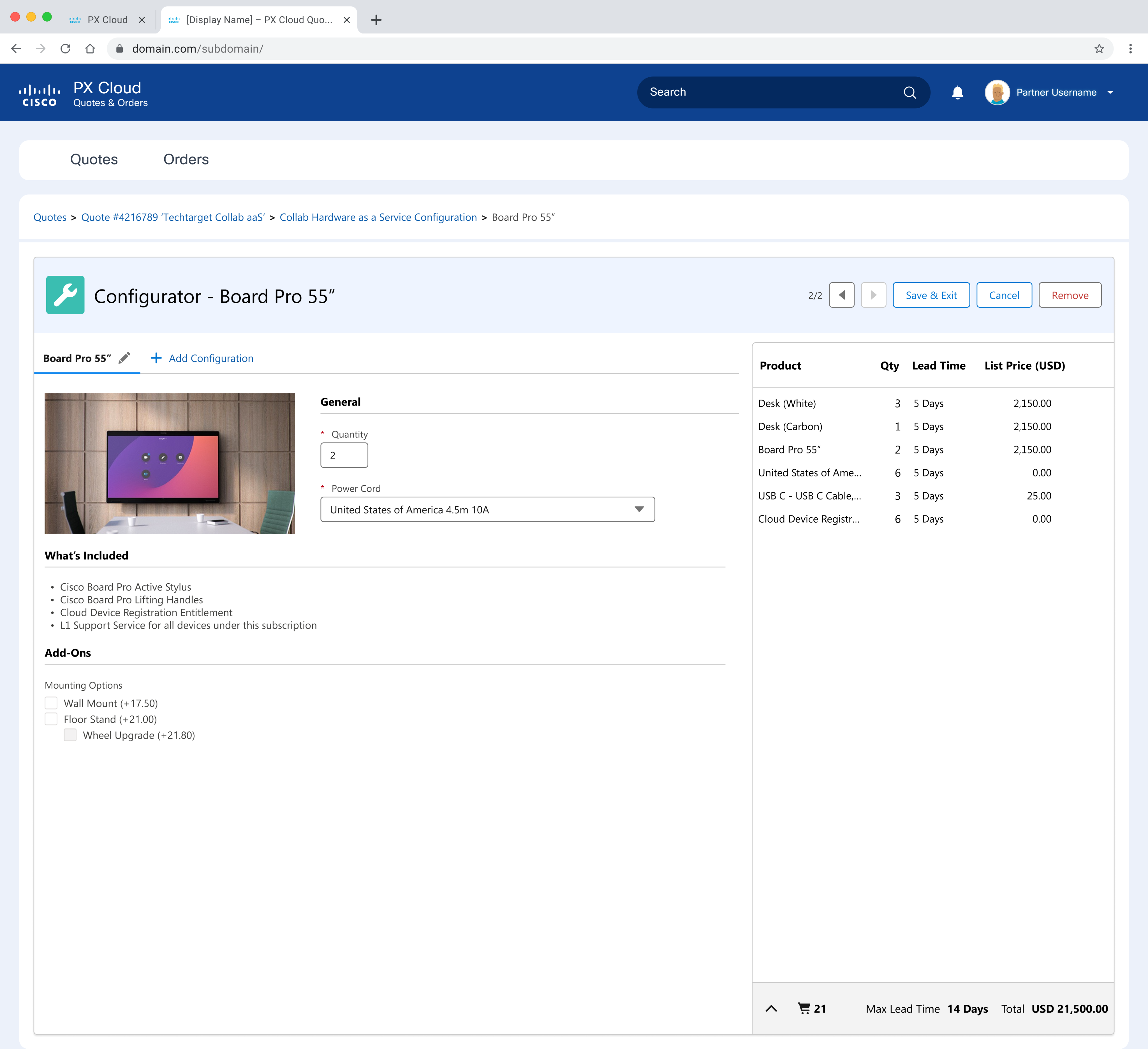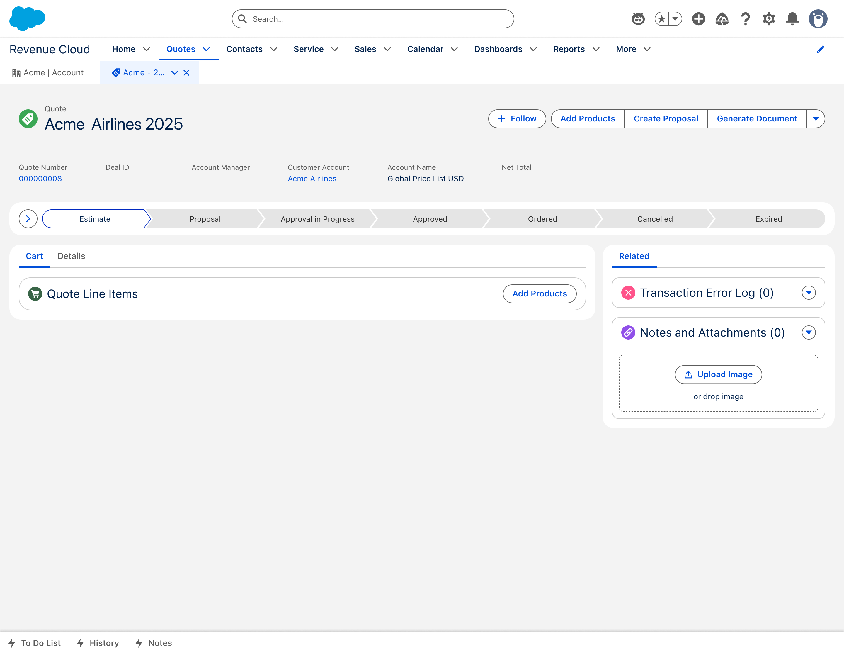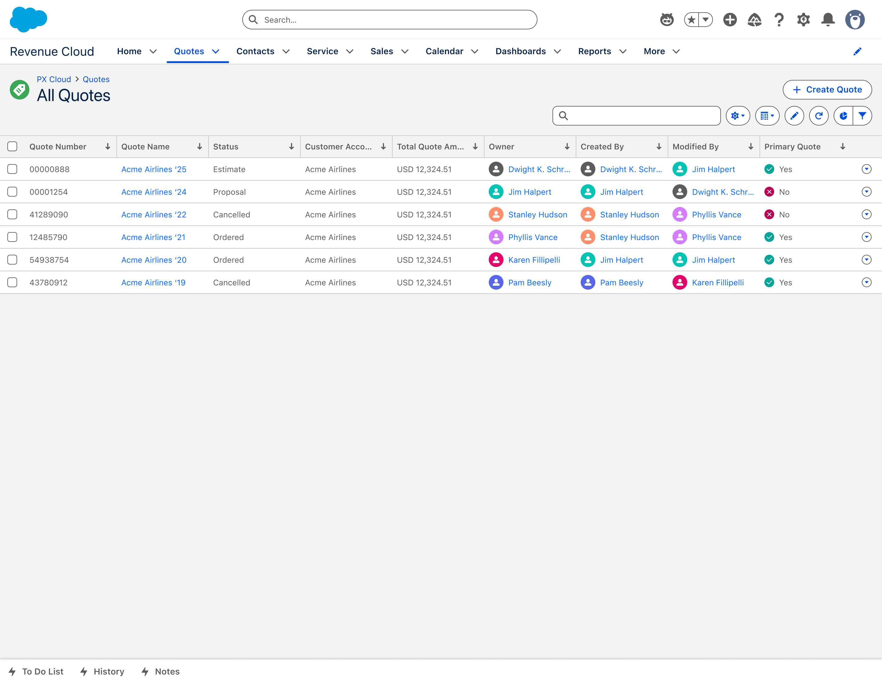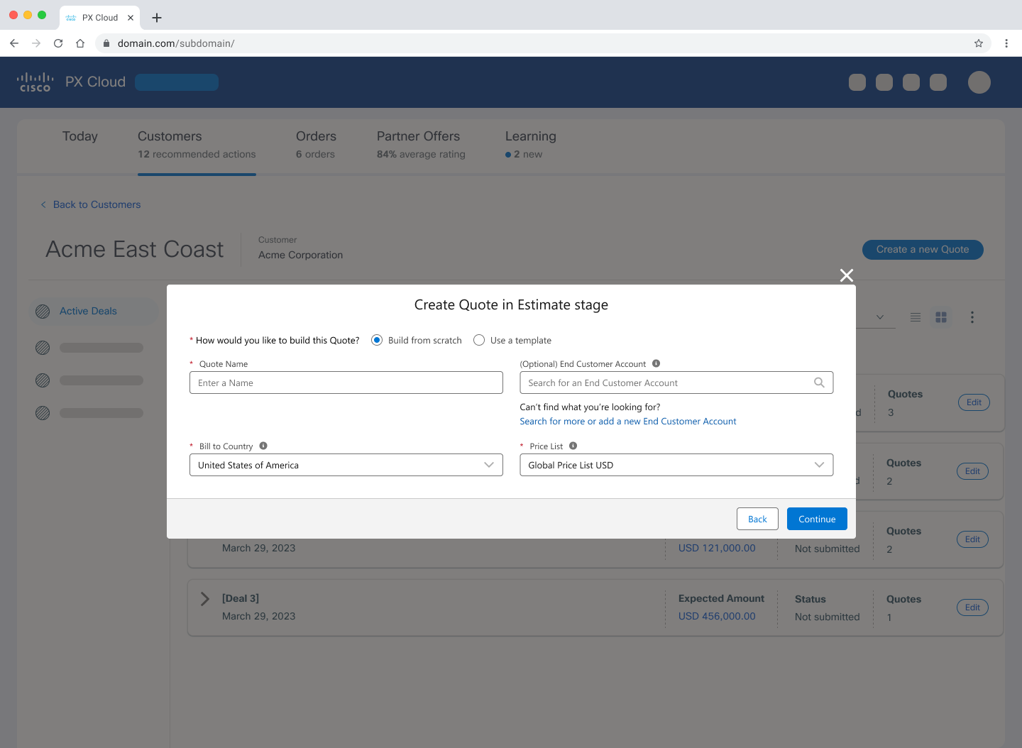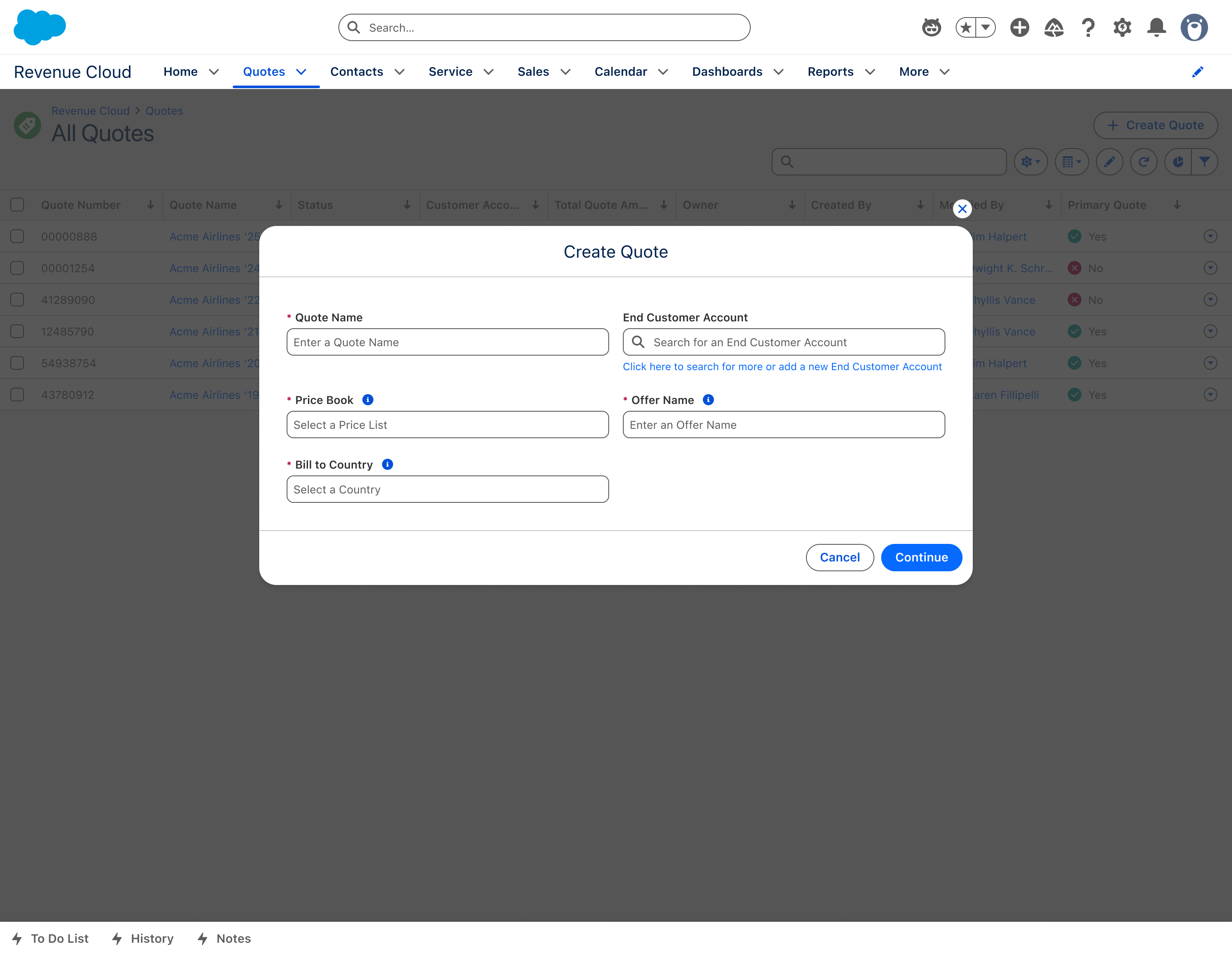 The ‘Create Quote’ modal launched from Salesforce but handed off to PX Cloud — a necessary split in P0, with plans to fully unify the flow in P1.