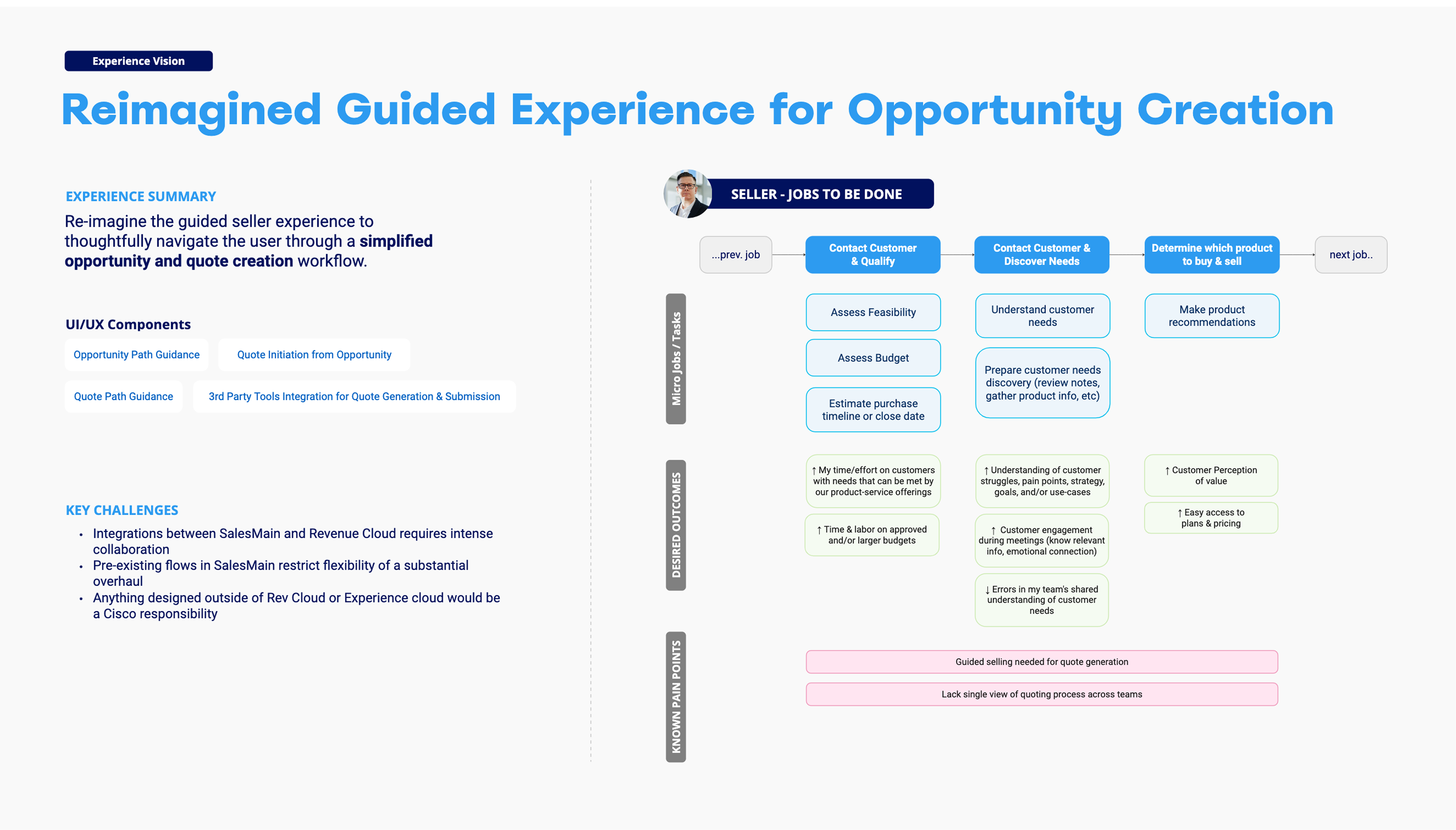 Cisco needed to migrate from a legacy quoting system to Salesforce Revenue Cloud—but their workflows were too complex for an off-the-shelf implementation. Our job was to design a custom CPQ (configure, price, quote) experience that would unify siloed tools, streamline data flows, and reduce sales inefficiencies.